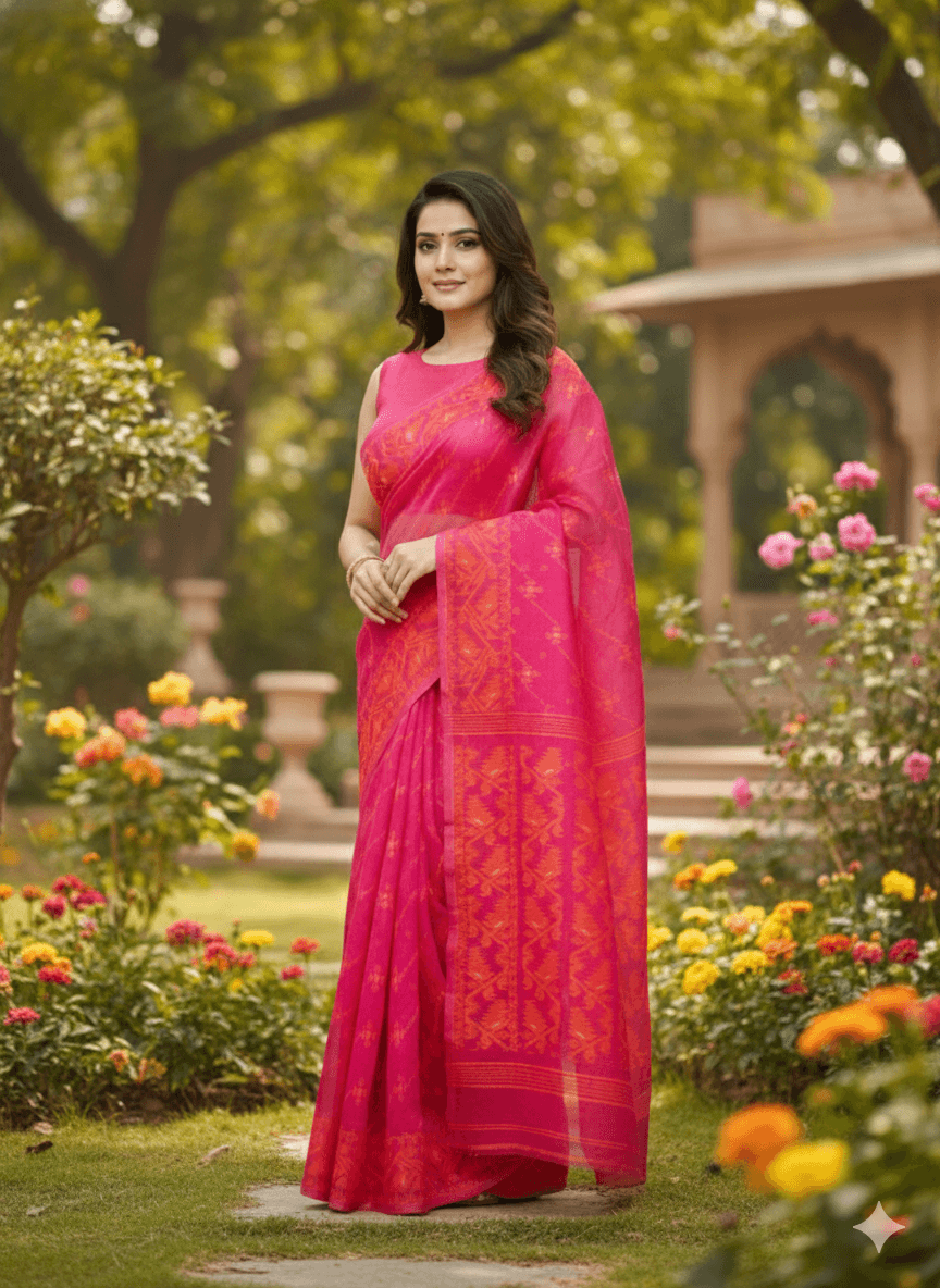 Step into a dream with Sheli’s Brand. The Semi Soft Jamdani in Rani Pink and Yellow combination that looks incredibly vibrant in photos. Adorned with delicate Yellow Floral Motifs.