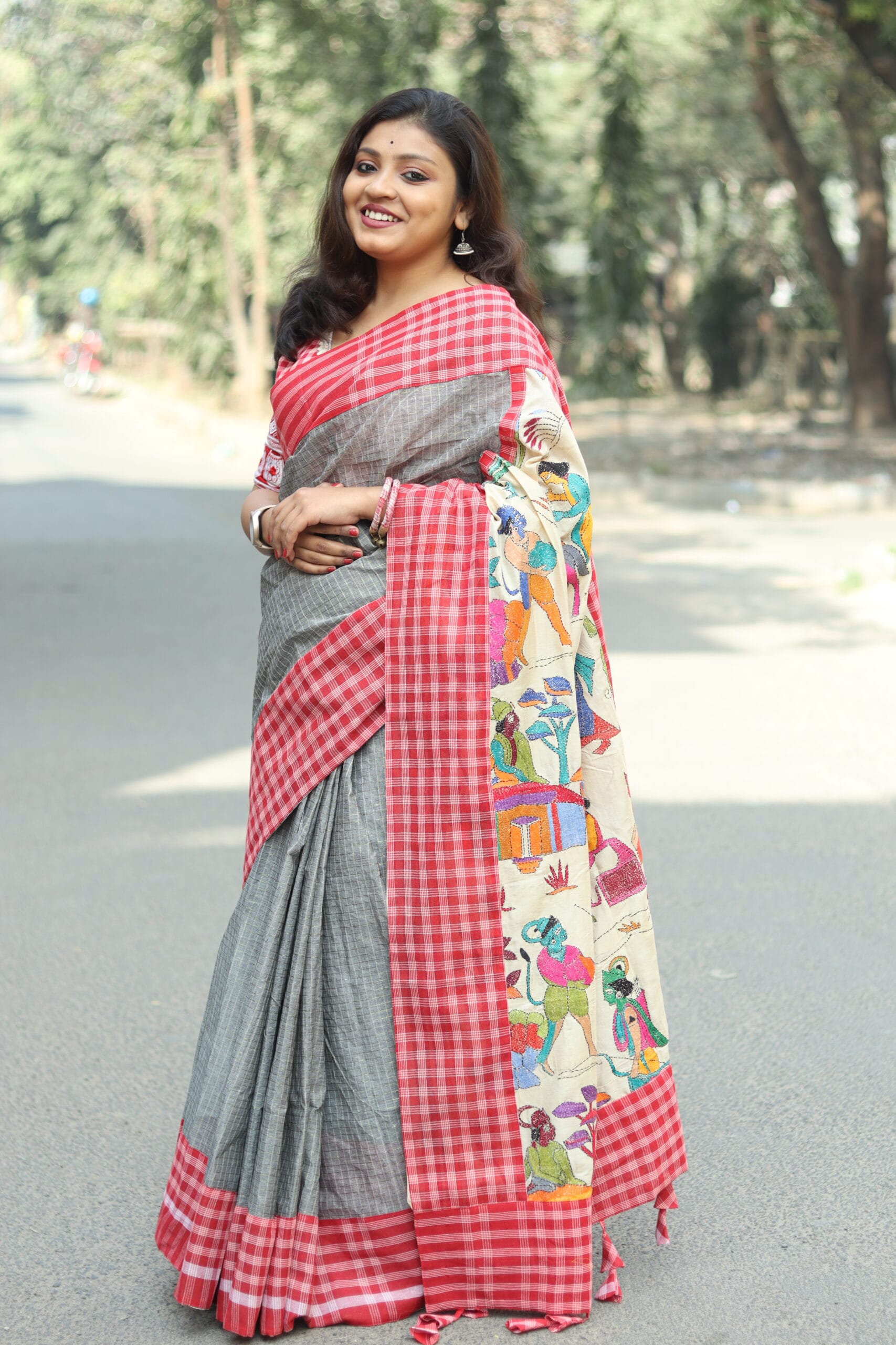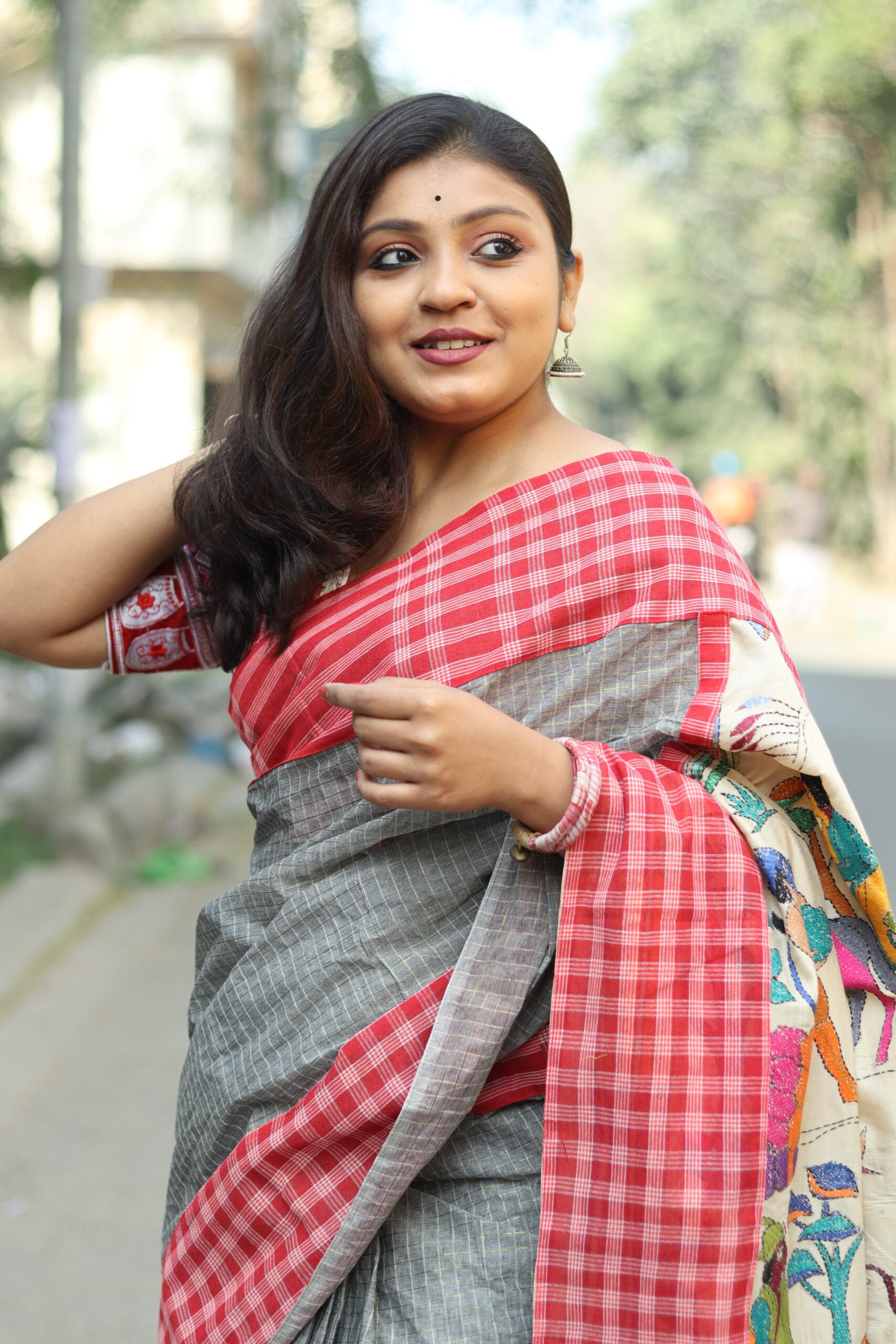Gamcha-Kantha Fusion Saree on Grey Checkered.
